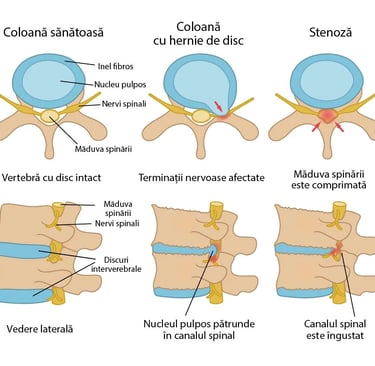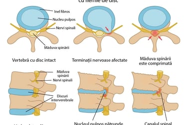 Coloana vertebrală este formată din vertebre între care se află discurile intervertebrale – structuri elastice care absorb șocurile și permit mișcarea. Hernia de disc apare atunci când nucleul pulpos (partea moale a discului) migrează în afara poziției normale și poate comprima nervii spinali.